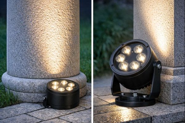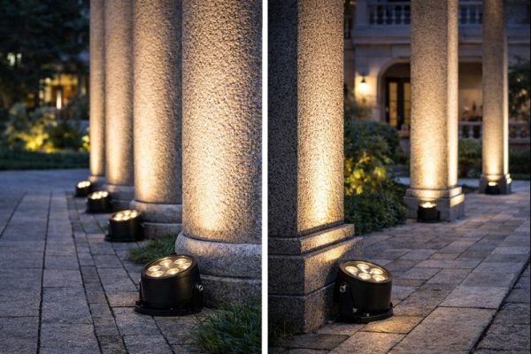 Cấu hình 6 mắt LED được bố trí theo mặt tròn giúp ánh sáng phân bố cân bằng, tạo mảng sáng liền mạch khi chiếu lên thân cột. Ánh sáng không bị tập trung quá gắt tại một điểm, đồng thời hạn chế vùng tối xen kẽ – yếu tố thường gặp ở các mẫu rọi ít mắt. Nhờ đó, cột trụ giữ được chiều cao thị giác và đường nét rõ ràng khi quan sát từ xa.
